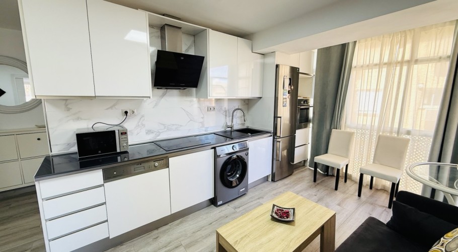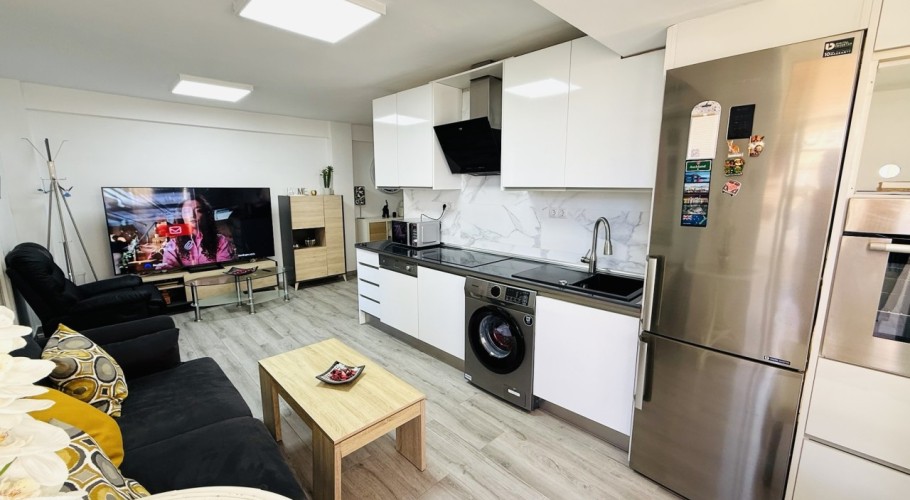 • Salón-comedor con cocina integrada, equipada con todos los electrodomésticos (horno, vitrocerámica, extractor, lavavajillas, lavadora y nevera).