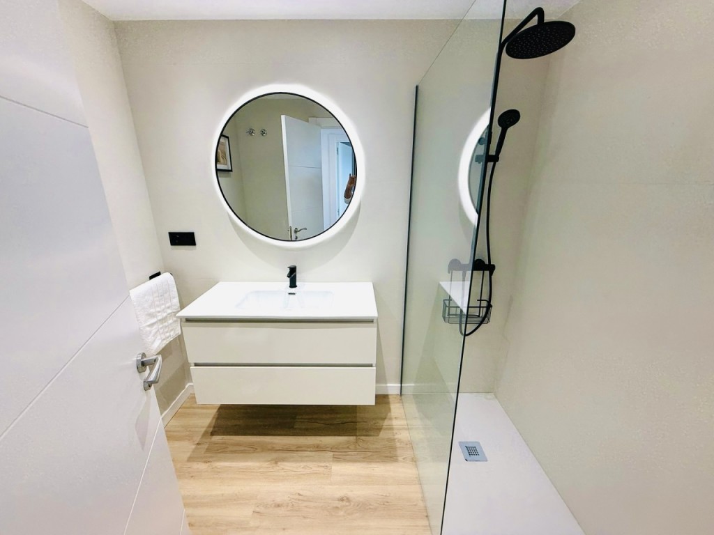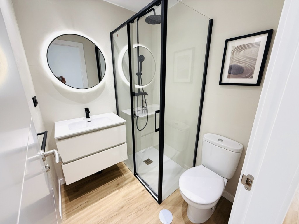 Полностью отремонтированные ванные комнаты оформлены в современном стиле со стеклянными перегородками и черными смесителями.