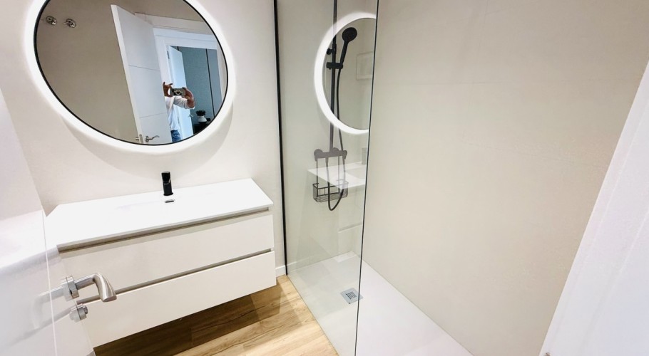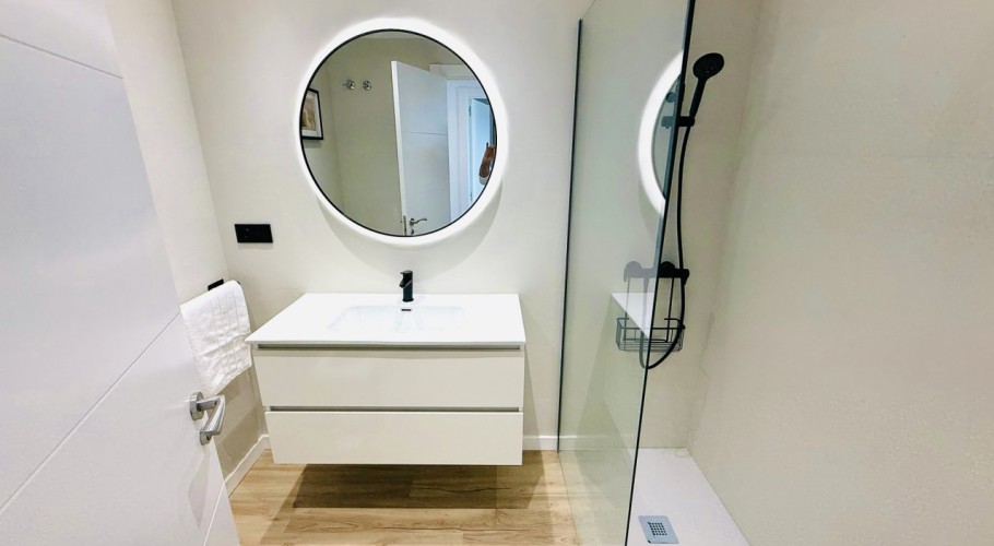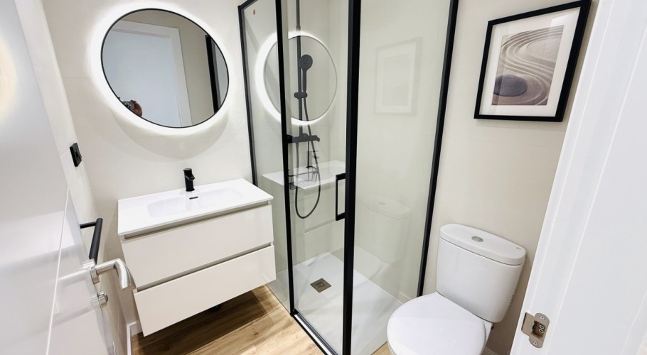 Полностью отремонтированные ванные комнаты оформлены в современном стиле со стеклянными перегородками и черными смесителями.